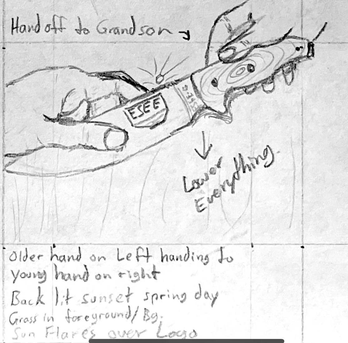 So this is it, the scene to wrap it all up and drive home what it’s all about. At this point, the blade was meant to be well-used, dirty, and part of a long list of memories. The original idea was for this knife to be handed down to the next generation. It’s a simple sketch, but a powerful one. The sun is setting on one story, and rising on another. Not much needs to be said beyond that. Here’s one more quick BTS video.