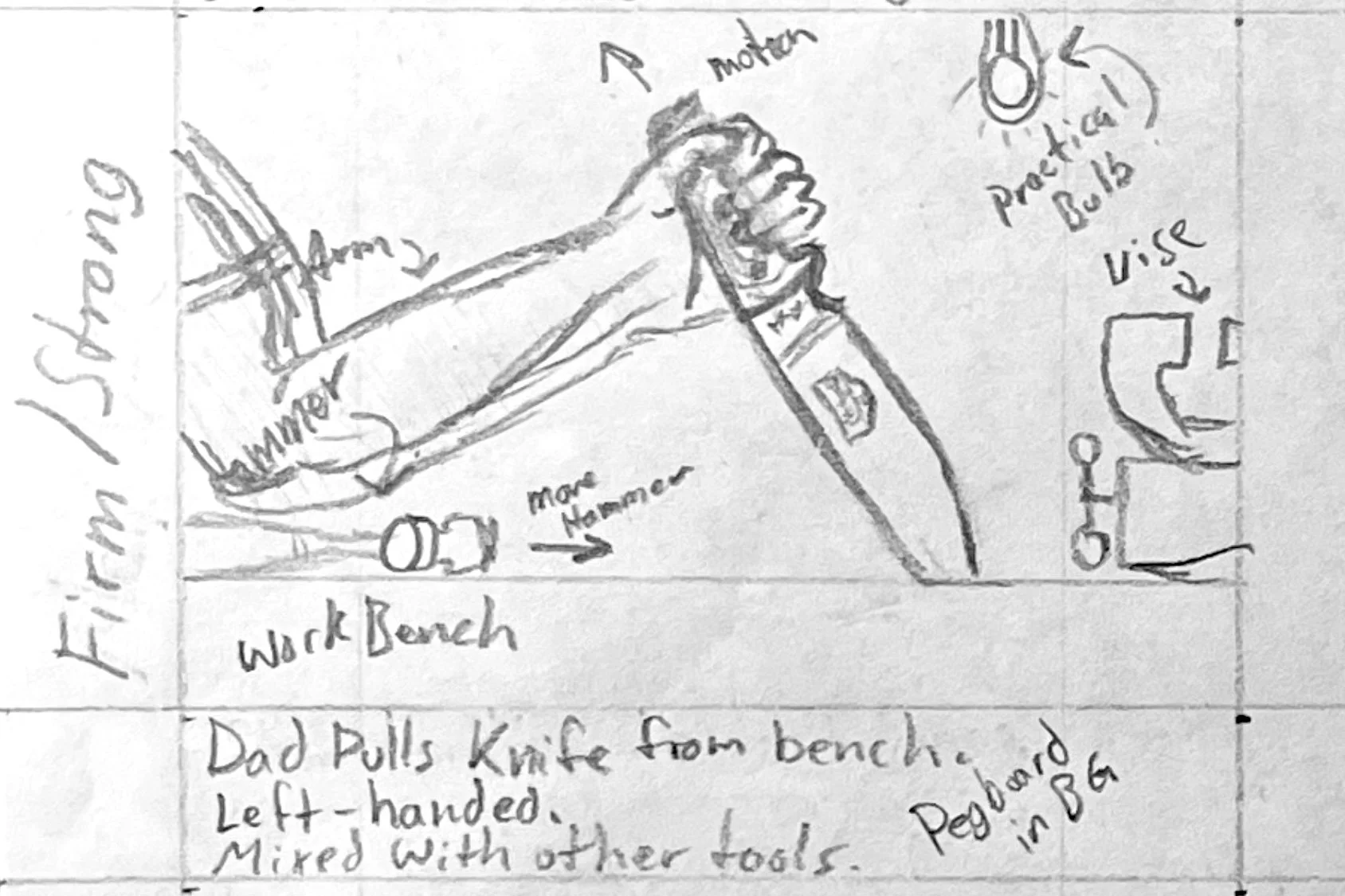 For the second scene, I wanted to once again reinforce the idea of this knife being a tool. When I think of tools, I think of a workbench in a warm, dark woodshed. This was also where I wanted to introduce the next character of the story, the user (aka my dad). A working man’s hands. Here’s a quick BTS.