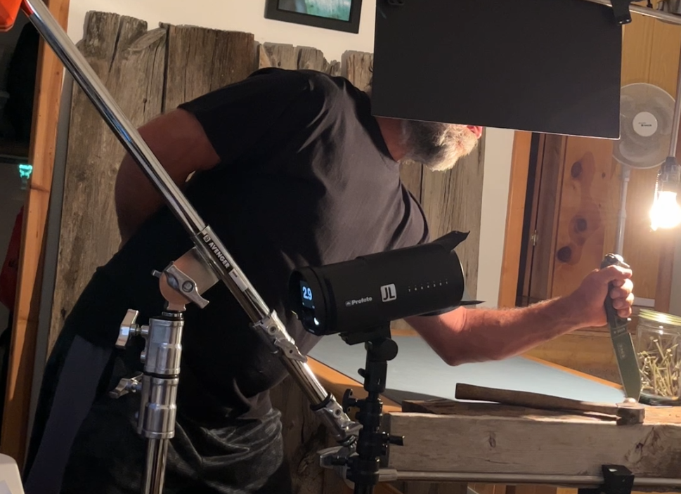 Unfortunately, I forgot to record the behind-the-scenes for this final shot, but here’s a quick breakdown. The knife was glued to a clear rod and strapped to a light stand to suspend it in front of the pegboard. I captured two shots, one with the knife in the scene, and one of the background only (without changing the focus point) to easily comp out the clear rod. I used 2 backlights up high to catch the top-left edge of the blade and the curve of the handle. These lights simultaneously lit the background. I had a hard light off to the right of the knife to reveal the texture on the handle. The key light was a round light source through a scrim to catch the logo. The sharp edge of the knife was illuminated by a smaller light coming from the lower right side of the camera.